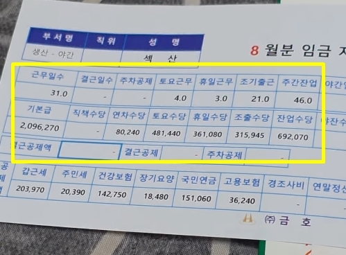 명세서 인증사진에 따르면 A 씨는 지난해 8월 한 달 동안 총 402만 7045원을 지급받았다. 기본급 209만 6270원에 연차수당 8만 240원, 토요수당 48만 1440원, 휴일수당 36만 1080원, 조기출근수당 31만 5945원, 잔업수당 69만 2070원 등이 더해진 금액이다.