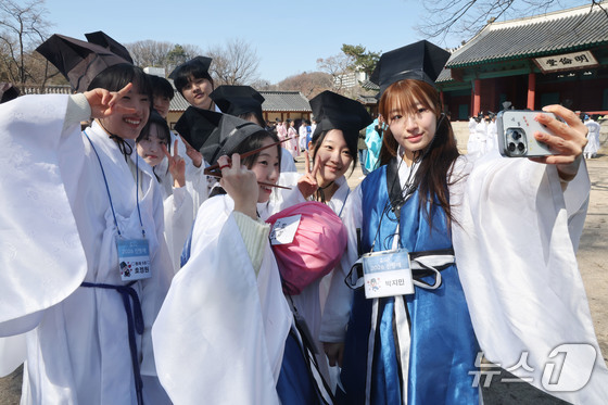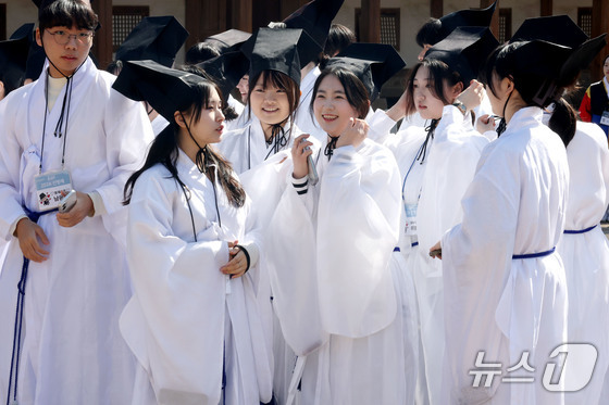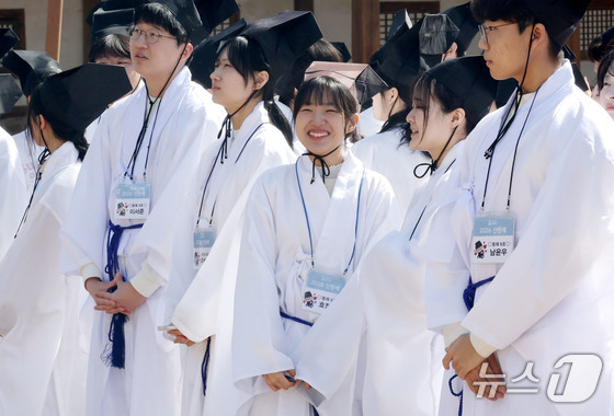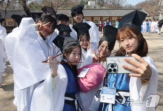 8일 오전 서울 종로구 성균관 문묘에서 열린 2026신방례(신입생 환영회)에서 유생 의복을 입은 성균관대학교 신입생들이 밝은 표정을 짓고 있다. 2026.3.8 © 뉴스1 이광호 기자