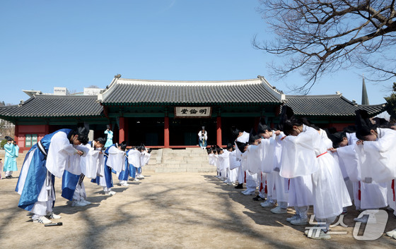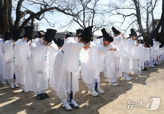 8일 오전 서울 종로구 성균관 문묘에서 열린 2026신방례(신입생 환영회)에서 유생 의복을 입은 성균관대학교 신입생들이 유교 성현들에게 인사를 드리는 알묘를 하고 있다. 신방례는 조선시대 과거에 합격한 유생들을 위한 환영식이자 선배들이 신입 유생을 맞이하는 일종의 통과의례이다. 2026.3.8 © 뉴스1 이광호 기자