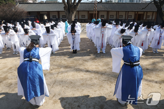8일 오전 서울 종로구 성균관 문묘에서 열린 2026신방례(신입생 환영회)에서 유생 의복을 입은 성균관대학교 신입생들과 재학생들이 서로 인사를 나누는 상읍례를 하고 있다. 신방례는 조선시대 과거에 합격한 유생들을 위한 환영식이자 선배들이 신입 유생을 맞이하는 일종의 통과의례이다. 2026.3.8 © 뉴스1 이광호 기자