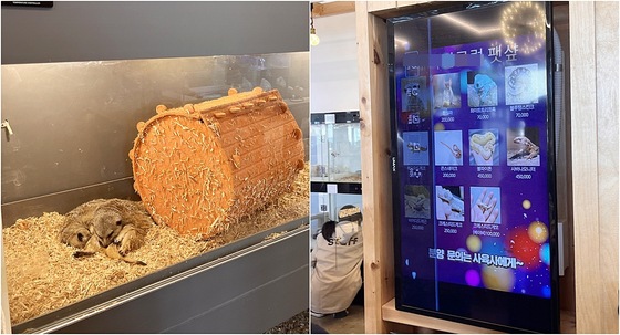 미어캣 등을 판매용으로 포장해 전시에 활용하는 모습(왼쪽)과 자동판매기처럼 야생동물 분양을 안내하는 모습(어웨어 제공) © 뉴스1