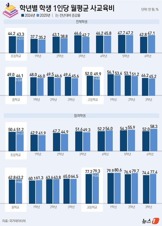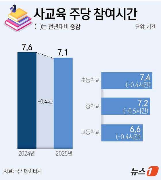 이와 관련해 사교육 참여율을 보면 2024년 80%에 달했지만 지난해에는 75.7%로 4.3%포인트(P) 줄었다.주당 사교육 참여시간도 7.1시간으로 전년보다 0.4시간 감소했다.