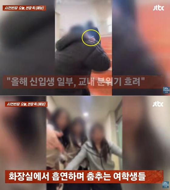 또 다른 영상에는 여자 고등학생 세 명이 화장실 거울 앞에서 담배를 피우는 모습이 담겼다. 이들은 춤을 추며 영상을 촬영하던 중 카메라를 향해 담배 연기를 내뿜는 장면도 보였다.