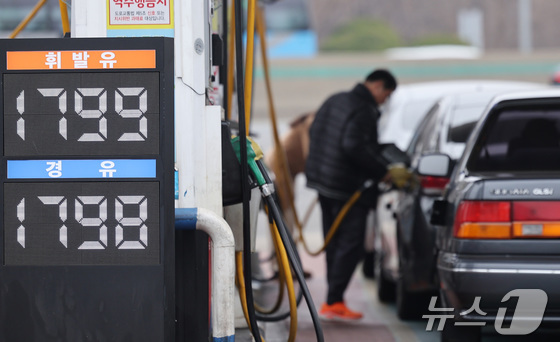 석유 최고가격제 시행 첫 주말을 맞은 15일 서울 서초구 만남의광장 주유소에서 시민들이 주유를 하고 있다. 유가정보시스템 오피넷에 따르면 이날 오전 10시25분 기준 전국 주유소 평균 휘발유 가격은 리터(ℓ)당 1842.1원으로 전날보다 3.2원 하락했다. 같은 시각 경유 가격은 1843.5원으로 4.5원 내렸다. 2026.3.15 © 뉴스1 김성진 기자
