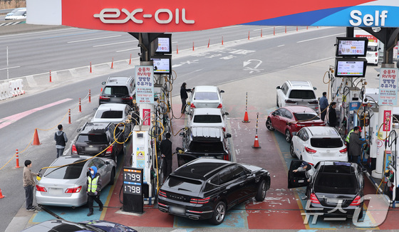 석유 최고가격제 시행 첫 주말을 맞은 15일 서울 서초구 만남의광장 주유소에서 시민들이 주유를 하고 있다. 2026.3.15 © 뉴스1 김성진 기자