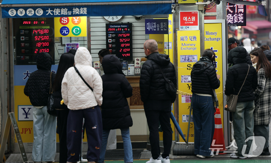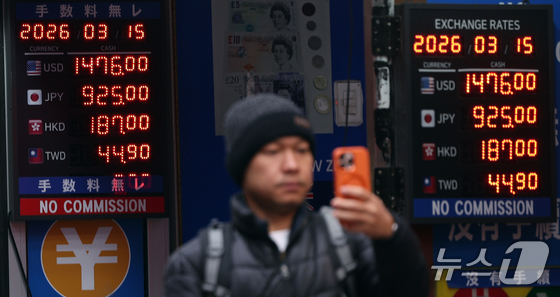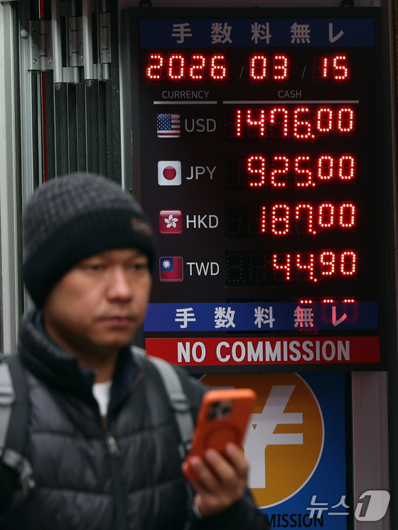 중동 상황 악화로 원·달러 환율이 오름세를 보이고 있는 15일 서울 중구 명동의 한 환전소 앞 전광판에 환율이 표시되고 있다. 2026.3.15 © 뉴스1 황기선 기자