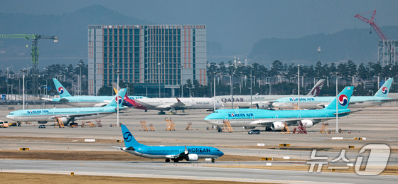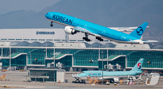 중동 사태가 장기화 조짐을 보이며 국제유가 오름세가 지속되고 있다. 이에 15일 항공 업계에 따르면 국내 항공사들이 다음 달 유류할증료는 이달보다 큰 폭으로 오를 것으로 예상돼 다음 달 발권하는 국제선 항공권 가격은 같은 노선이라도 이달보다 많게는 10만원 이상 비싸질 수 있다는 우려가 나오고 있다. 사진은 이날 인천국제공항 계류장에 항공기가 이륙하는 모습. 2026.3.15 © 뉴스1 이호윤 기자