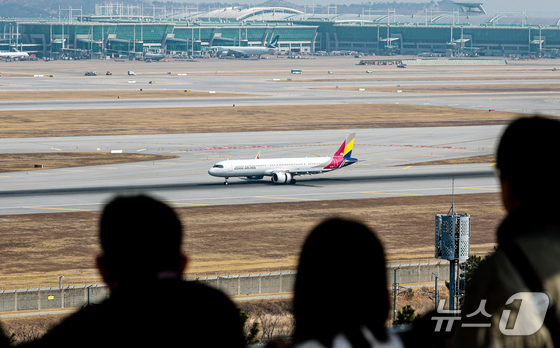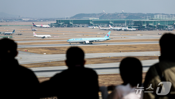 15일 인천공항 전망대를 찾은 시민들이 항공기들을 바라보고 있다. 2026.3.15 © 뉴스1 이호윤 기자
