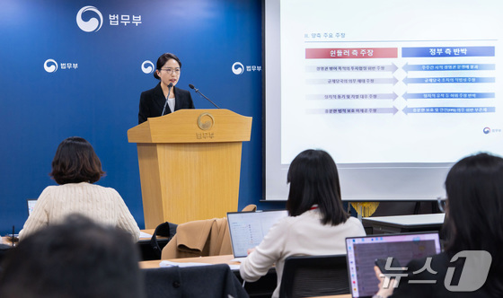 조아라 법무부 국제법무부 국제투자분쟁과장이 16일 정부과천청사 법무부 브리핑룸에서 쉰들러 ISDS 승소 관련 브리핑을 하고 있다. (법무부 제공. 재판매 및 DB 금지) 2026.3.16 © 뉴스1
