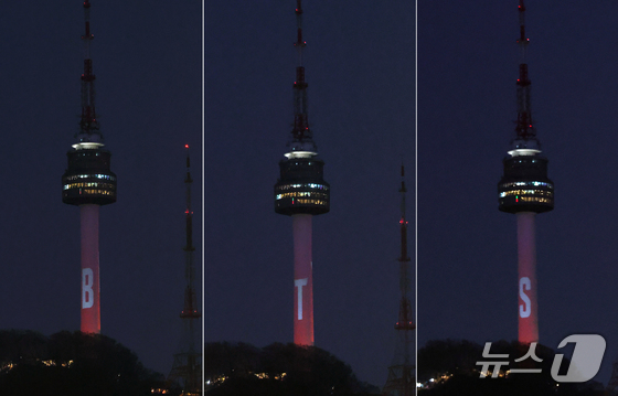 3년 9개월 만에 완전체로 컴백하는 방탄소년단(BTS)의 광화문 공연을 하루 앞둔 20일 오후 서울 중구 남산타워에 BTS 신보 '아리랑'(ARIRANG)을 주제로 한 미디어 파사드가 펼쳐지고 있다. 2026.3.20 © 뉴스1 오대일 기자