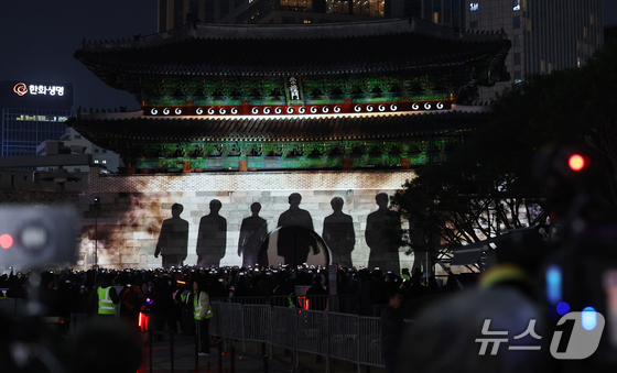 3년 9개월 만에 완전체로 컴백하는 방탄소년단(BTS)의 광화문 공연을 하루 앞둔 20일 오후 서울 중구 숭례문 외벽에 BTS 신보 '아리랑'(ARIRANG)을 주제로 한 미디어 파사드가 펼쳐지고 있다. 2026.3.20 © 뉴스1 오대일 기자