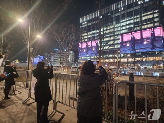 명동 신세계스퀘어 전광판에는 오전 1시쯤부터 BTS 5집 앨범 '아리랑'의 타이틀곡 'SWIM' 뮤직비디오가 흐르고 있다. 전광판 건너편 인도에는 셀카봉을 80여 명의 팬들이 빈틈없이 늘어서서 기념사진과 영상을 찍는 데 여념이 없었다. 일부는 가방에 BTS 캐릭터 키링과 포토카드를 달고 있었다.
