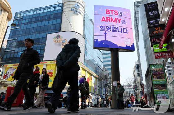 방탄소년단(BTS) 컴백 공연일인 21일 오전 서울 중구 명동거리의 미디어폴에 BTS와 팬클럽 아미를 환영하는 메시지가 송출되고 있다. 2026.3.21 © 뉴스1 김진환 기자