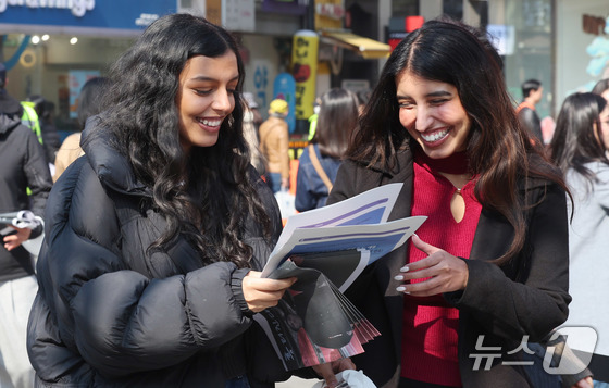 방탄소년단(BTS) 컴백 공연일인 21일 오전 서울 광화문광장 인근에서 BTS 관련 호외를 든 외국인 관광객이 미소 짓고 있다. 2026.3.21 © 뉴스1 박지혜 기자