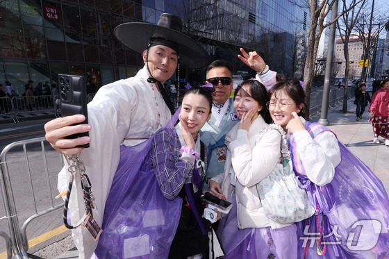 방탄소년단(BTS) 컴백 공연일인 21일 서울 광화문광장 인근에서 한복을 입은 아미들이 기념촬영을 하고 있다. 2026.3.21 © 뉴스1 박지혜 기자