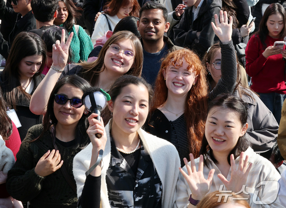 방탄소년단(BTS) 컴백 공연일인 21일 오전 서울 종로구 광화문광장에서 팬들이 공연 시작을 기다리며 취재진을 향해 환호하고 있다. 2026.3.21 © 뉴스1 김진환 기자