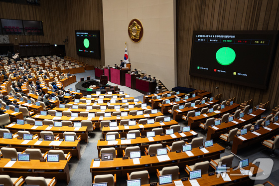 21일 서울 여의도 국회에서 열린 제433회 국회(임시회) 제2차 본회의에서 중대범죄수사청 조직 및 운영에 관한 법률안(대안)이 재석 167인 중 찬성 166인, 반대 1인으로 가결되고 있다. 2026.3.21 © 뉴스1 유승관 기자