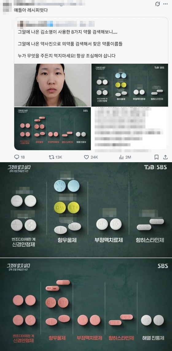 24일 X(구 트위터) 등 SNS(소셜미디어)와 각종 온라인 커뮤니티에는 김소영이 사용한 것으로 알려진 약물 종류를 정리한 게시물이 빠르게 퍼져나갔다.