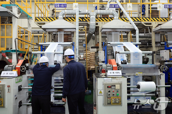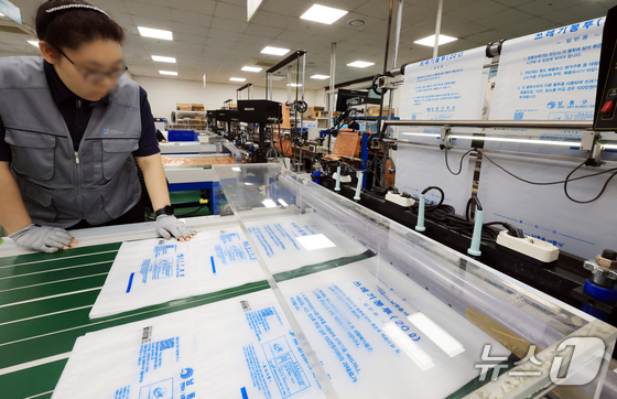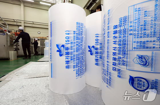 중동 전쟁의 장기화로 원재료인 나프타 등 석유화학제품 수급 문제가 계속되는 3일 인천 서구 장애인 직업재활시설에서 관계자들이 종량제봉투를 생산하고 있다. 2026.4.3 © 뉴스1 이호윤 기자