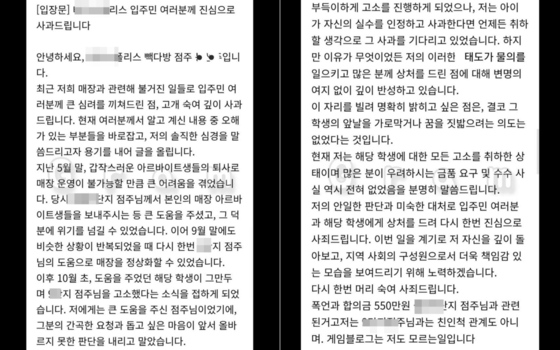 그는 "이후 10월 초, 도움을 주었던 해당 학생이 그만두며 9단지 점주님을 고소했다는 소식을 접하게 됐고, 저에게는 큰 도움을 주신 점주님이었기에 그분의 간곡한 요청과 돕고 싶은 마음이 앞서 올바르지 못한 판단을 내리게 됐다"고 밝혔다.