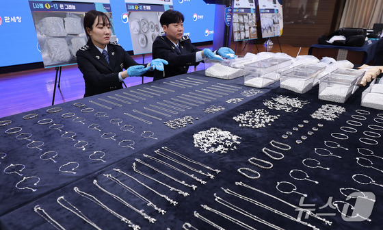 8일 오전 인천 중구 인천공항세관에서 열린 은 밀수 증가에 따른 집중 단속 방안 브리핑에 앞서 관계자들이 적발 물품을 공개하고 있다. 2026.4.8 © 뉴스1 이종수 인턴기자