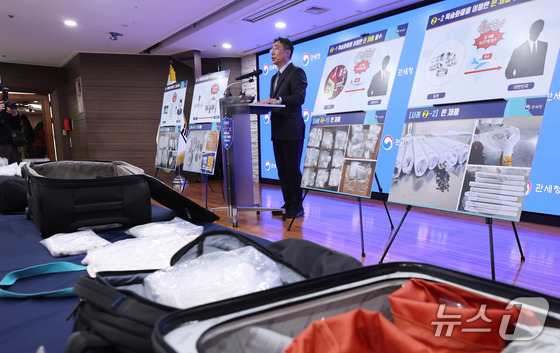 김정 관세청 조사국장이 8일 인천 중구 인천공항세관 수출입통관청사 대회의실에서 최근 은 밀수 급증에 따른 집중 단속 방안에 대해 발표하고 있다. © 뉴스1 박지혜 기자