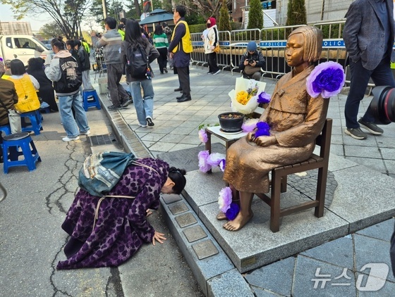 8일 서울 종로구 옛 주한 일본대사관 인근 평화의 소녀상 앞에서 한 시민이 절을 하고 있다. 2026.4.8 © 뉴스1 신윤하 기자