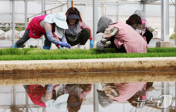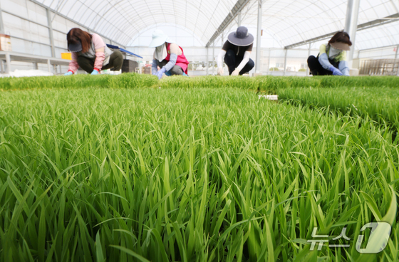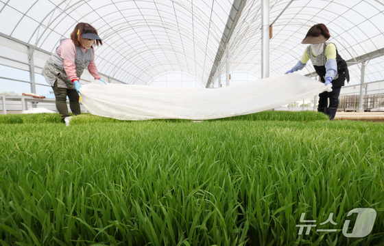 절기상 곡우를 나흘 앞둔 16일 경기 수원시 권선구 농촌진흥청 국립식량과학원 중북부작연구센터 작물연구동에서 관계자들이 본격적인 벼농사를 앞두고 모 기르기(육묘) 작업을 하고 있다. 2026.4.16 © 뉴스1 김영운 기자