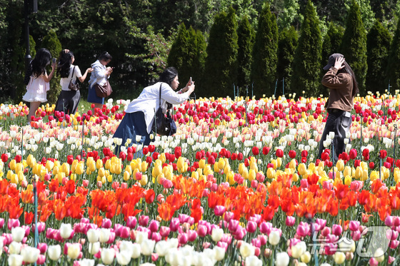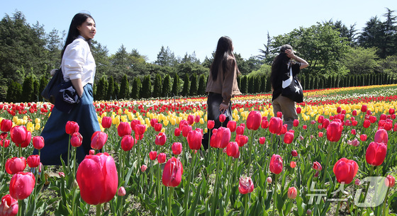 초여름 날씨를 보인 16일 대구 달서구 테마파크 이월드를 찾은 시민들이 곱게 핀 튤립정원을 감상하고 있다. 2026.4.16 © 뉴스1 공정식 기자
