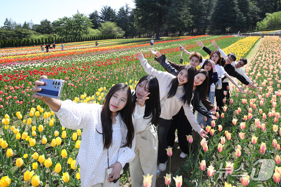 초여름 날씨를 보인 16일 대구 달서구 테마파크 이월드를 찾은 대구가톨릭대 언어교육원 한국어과정 유학생들이 곱게 핀 튤립정원에서 기념촬영을 하고 있다. 2026.4.16 © 뉴스1 공정식 기자