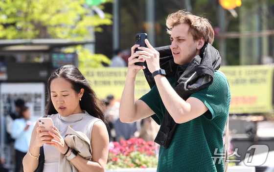서울 낮 최고 기온이 25도를 웃돌며 초여름 날씨가 이어지는 16일 서울 종로구 광화문광장에서 외국인 관광객들이 사진을 찍고 있다. 2026.4.16 © 뉴스1 최지환 기자