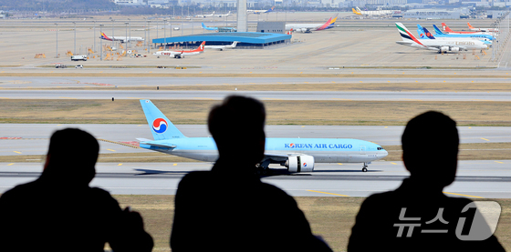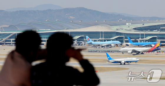 중동 사태에 장기화로 국제선 항공권의 유류할증료가 사상 최고 수준으로 치솟은 16일 인천국제공항 전망대를 찾은 시민들이 항공기를 바라보고 있다. 2026.4.16 © 뉴스1 이호윤 기자