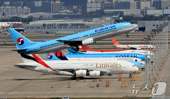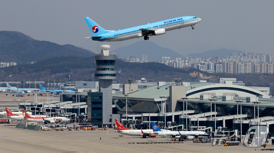 중동 사태에 장기화로 국제선 항공권의 유류할증료가 사상 최고 수준으로 치솟은 16일 인천국제공항 계류장에서 항공기가 이륙하고 있다. 이날 항공업계에 따르면 5월 발권 국제선 항공권에는 유류할증료가 최고 수준인 33단계로 책정됐다. 대한항공 장거리 노선인 뉴욕·보스턴·시카고 등의 유류할증료는 지난달 9만9000원에서 5월 56만4000원으로 5배 넘게 상승했다. 2026.4.16 © 뉴스1 이호윤 기자