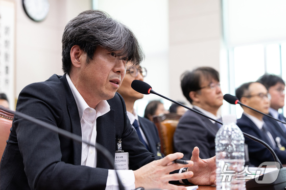 16일 서울 여의도 국회에서 열린 윤석열 정권 정치검찰 조작기소 의혹 사건 진상규명 국정조사특별위원회 대장동·김용 전 민주연구원 부원장·위례신도시 조작기소 의혹 사건 청문회에 증인으로 출석한 정일권 당시 중앙지검 부장검사가 의원 질의를 듣고 있다. 2026.4.16 © 뉴스1 이승배 기자