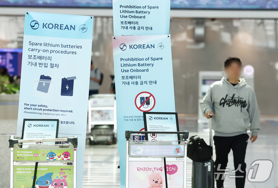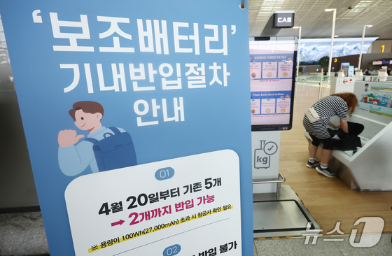 19일 오후 인천국제공항에 기내 보조배터리 반입 개수 제한 안내문이 놓여 있다. 국토교통부에 따르면 오는 20일부터 항공기에 들고 탈 수 있는 보조배터리 개수가 최대 2개(용량 160Wh 이하)로 제한된다. 또 기내에서는 보조배터리로 전자기기를 충전(사용)하거나 보조배터리를 충전하는 것도 전면 금지된다. 2026.4.19 © 뉴스1 김민지 기자