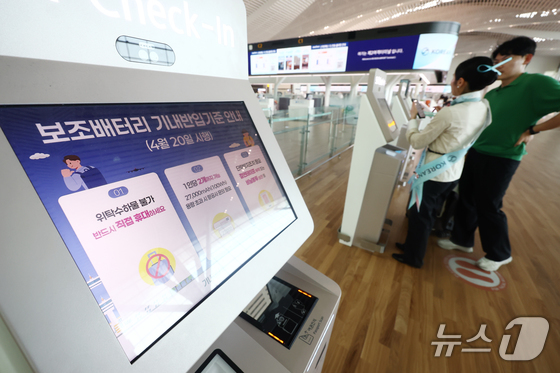 19일 오후 인천국제공항에 놓인 셀프 체크인 키오스크에 기내 보조배터리 반입 개수 제한 안내문이 나오고 있다. 2026.4.19 © 뉴스1 김민지 기자