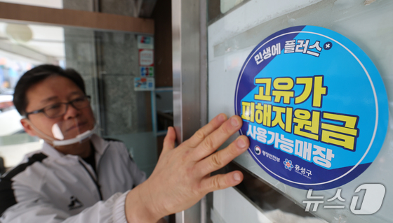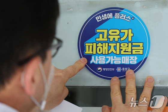 고유가 피해지원금 신청을 앞두고 23일 대전 유성구 한 식당 주인이 피해지원금 사용가능매장 안내문을 붙이고 있다. 2026.4.23 © 뉴스1 김기태 기자