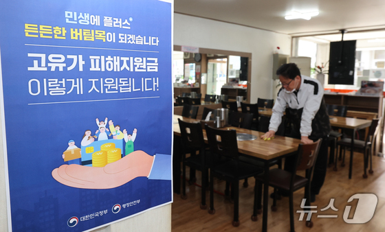 고유가 피해지원금 신청을 앞두고 23일 대전 유성구 한 식당에서 지역경제과 직원들이 피해지원금 안내문을 붙이고 있다. 2026.4.23 © 뉴스1 김기태 기자