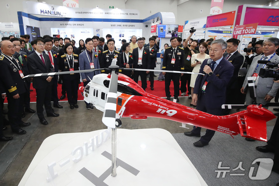 28일 대구 북구 엑스코(EXCO)에서 개막한 '2025 국제소방안전박람회'를 찾은 관람객들이 산불진화용 헬기를 살펴보고 있다. 2025.5.28 © 뉴스1 공정식 기자