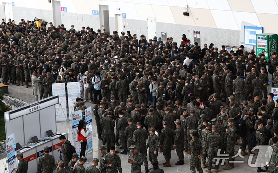 28일 경기 고양 킨텍스에서 열린 2026년 국군장병 취업박람회에서 장병들이 입장을 기다리고 있다. 2026.4.28 © 뉴스1 김민지 기자