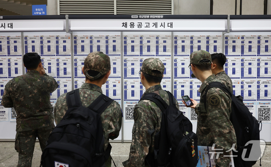 28일 경기 고양 킨텍스에서 열린 2026년 국군장병 취업박람회에서 장병들이 채용공고 게시판을 살피고 있다. 2026.4.28 © 뉴스1 김민지 기자