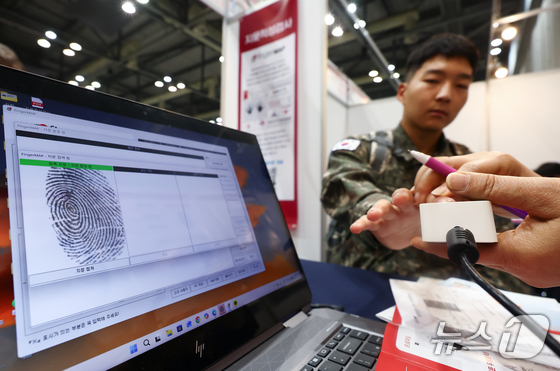 28일 경기 고양 킨텍스에서 열린 2026년 국군장병 취업박람회에서 장병들이 지문을 이용한 적성검사를 하고 있다. 2026.4.28 © 뉴스1 김민지 기자