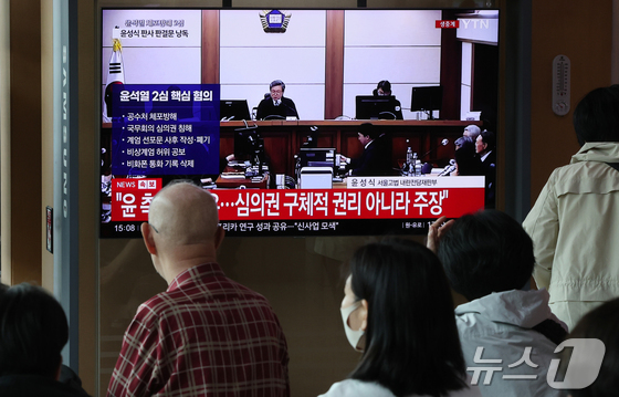 29일 오후 서울시 용산구 한강대로 서울역 대합실에서 시민들이 특수공무집행방해, 직권남용 권리행사방해, 허위공문서 작성 등의 혐의를 받는 윤석열 전 대통령의 항소심 선고 공판 생중계를 지켜보고 있다. 2026.4.29 © 뉴스1 김진환 기자