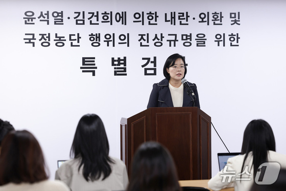 김지미 특검보가 2일 오후 경기 과천 2차 종합특검팀 사무실에서 브리핑을 하고 있다. 2026.4.2 © 뉴스1 임지훈 인턴기자