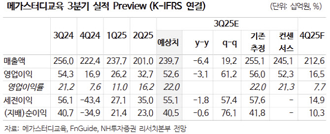 3분기 연결기준 매출액은 2397억원(전년 동기 대비 6%↓), 영업이익 526억원(3%↓)으로 컨센서스 부합하는 실적을 예상했다. 그는 “사업 부문별 매출액 성장률은 유·초·중등 4%↓, 고등 4%↓, 성인 15%↓로 추정한다”며 “성인 부문은 지난해 공무원 사업(2024년 매출액 347억원, 영업적자 70억원)을 매각하면서 매출은 4분기까지 감소 추세를 보이고 있으나, 수익성은 양호할 전망”이라고 분석했다.