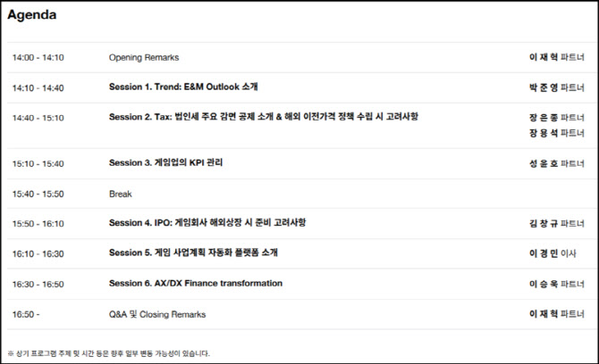 이번 세미나를 기획한 이재혁 삼일PwC 게임 및 가상자산 산업 리더(파트너)는 “AI 기술과 글로벌 확장 전략이 게임 산업의 핵심 키워드로 떠오른 지금, 이번 세미나가 업계 관계자들에게 실질적인 인사이트와 전략적 방향성을 제시하는 자리가 되길 기대한다”고 말했다.