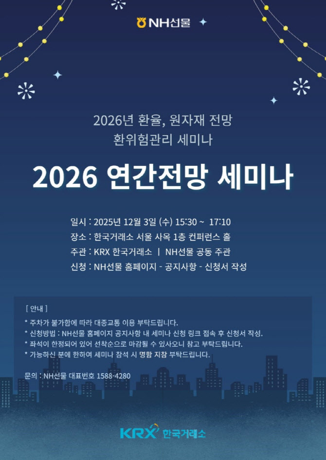 NH선물 관계자는 “2026년은 금리·환율·원자재 등 주요 시장 변수들이 동시에 변동성을 높일 수 있는 환경”이라며 “이번 세미나를 통해 고객들이 내년도 경영 전략과 환리스크 관리에 실질적 도움을 얻기를 바란다”고 말했다.