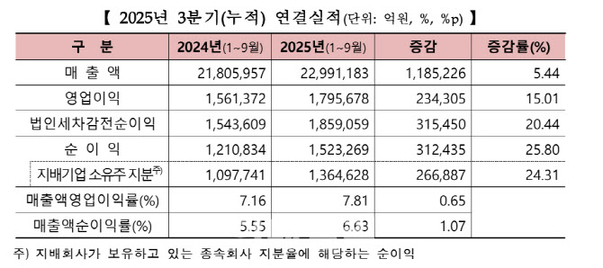 연결 기준(639개사)으로 보면 개선 폭이 더 컸다. 매출액은 2299조1183억원으로 5.4%, 영업이익은 179조5678억원으로 15.0%, 순이익은 152조3269억원으로 25.8% 각각 늘었다. 매출액영업이익률은 7.81%로 전년 동기(7.16%) 대비 0.65%포인트 올랐다.