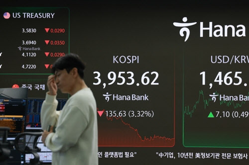 18일 엠피닥터에 따르면 코스피는 전거래일 대비 135.63포인트(3.32%) 내린 3953.62에 거래를 마쳤다. 이날 지수는 전장 대비 44.87포인트(1.10%) 내린 4044.47에 출발해 장중 낙폭을 키웠다. 코스피가 종가 기준 4000선을 하회한 것은 지난 7일(종가 3953.76) 이후 7거래일 만이다.