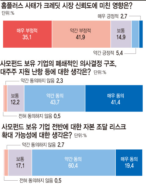 다만 홈플러스 사태로 향후 사모펀드 소유 기업에 대한 정밀 심사와 리스크 프리미엄 요구가 증가할 것으로 보이면서 조달 비용 상승은 불가피할 전망이다. SRE 설문에서 ‘사모펀드 보유 기업 전반에 대한 자본 조달 리스크 확대 가능성’을 묻는 질문에 134명(60.4%)은 ‘약간 동의한다’, 43명(19.4%)은 ‘매우 동의한다’고 답했다.